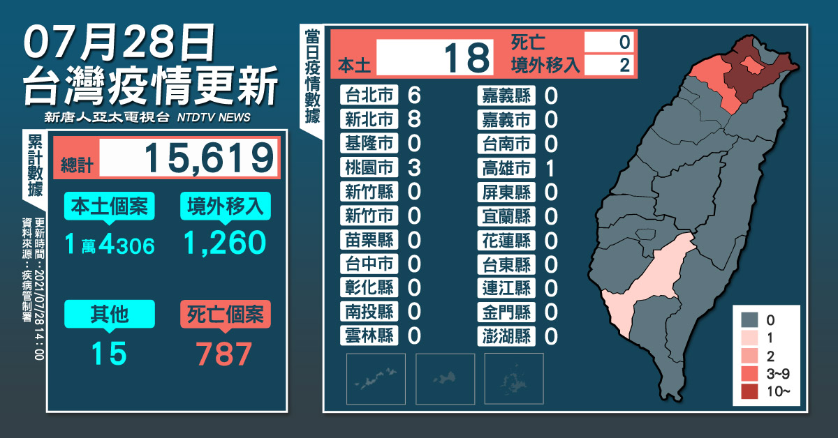 【新唐人亞太台 2021 年 07 月 28 日訊】今(28)日中央流行疫情指揮中心公布,國內新增20例COVID-19確定病例,分別為18例本土及2例境外移入;另確診個案中無新增死亡。