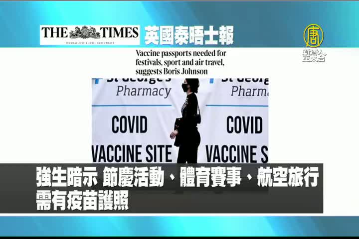 【新唐人亞太台 2021 年 07 月 29 日訊】接著是英國泰晤士報的報導:英國首相強生暗示,參加節慶活動、體育賽事和航空旅行等可能會強制要求有疫苗護照。
