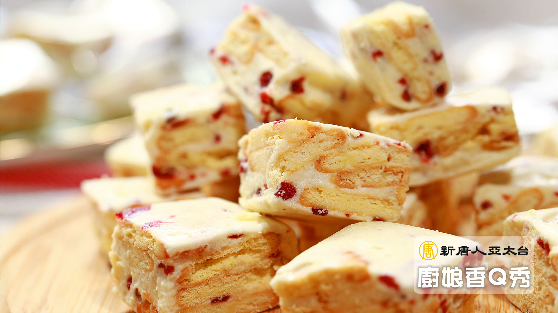 食材:棉花糖250g、奶粉60g、無鹽奶油60g、奇福餅乾200g、蔓越莓乾碎50g。