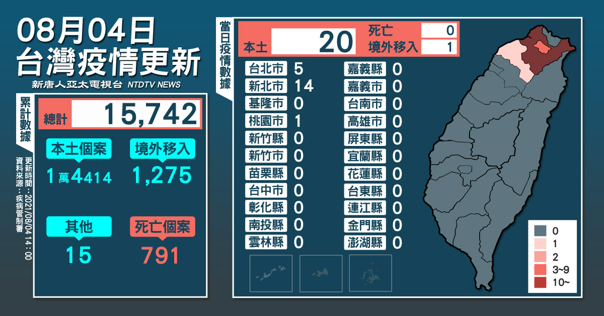 【新唐人亞太台 2021 年 08 月 04 日訊】中央流行疫情指揮中心今(4)日公布,國內新增20例本土及1例境外移入;另確診個案中無新增死亡。