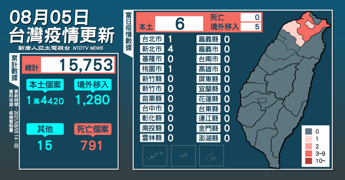 【新唐人亞太台 2021 年 08 月 05 日訊】今(5)日中央流行疫情指揮中心公布,國內新增6例本土及5例境外移入;另確診個案中無新增死亡。