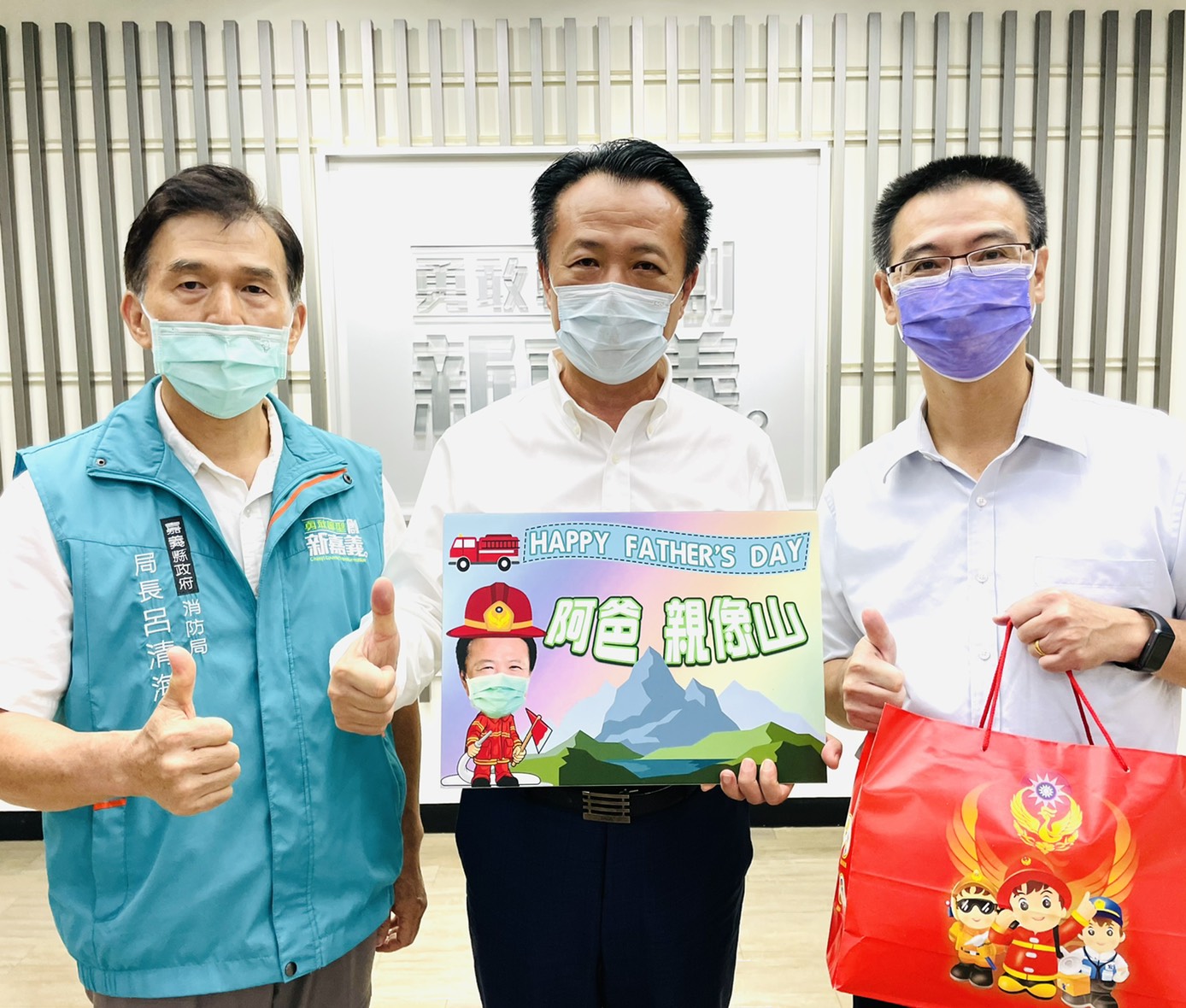 嘉義縣長翁章梁指出,這個星期日就是一年一度的父親節,「父親像一座山」,給我們依靠;「像一棵大樹」,為我們擋風遮雨。消防人員像山也像大樹,總是無畏無情水火的保護民眾,讓我十分感佩!因此,在父親節前夕,特別致贈每位消防同仁特製父親節口罩及鮮花,以表達祝福與感謝之意。