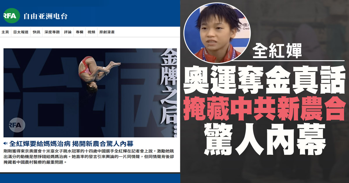 鏡頭前這位中國女孩,奪下東奧女子10公尺跳水金牌,賽後受訪時,她率真的說「媽媽生病了,不知道她得什麼病,很想賺錢回去給她治病」,這段溫馨發言的背後,掩藏的卻是中國農村嚴重的醫療問題。