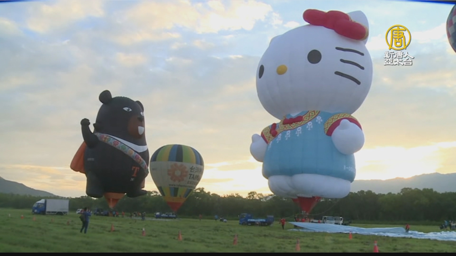 天才稍微亮起,三顆熱氣球就已經載著民眾,緩緩升空,一旁的主秀,Hello Kitty及喔熊造型熱氣球,也正在由工作人員,進行出場前的最後準備。