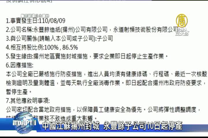【新唐人亞太台 2021 年 08 月 10 日訊】中國大陸疫情有蔓延現象,江蘇省揚州地區,進一步實施封城管制,當地台商也傳出受到波及。台灣永豐餘公告,旗下在揚州兩家子公司,包括永豐餘造紙(揚州),永道射頻,10日起全面暫時停產,將採取彈性調度,預估對財務不至於造成重大影響。此外,媒體報導,當地揚州台商協會會長 方丁玉表示,當地台灣企業員工,無人感染疫情,目前配合當地措施,已經停工一個星期,未來台灣企業會隨防疫情況,逐步復工。
