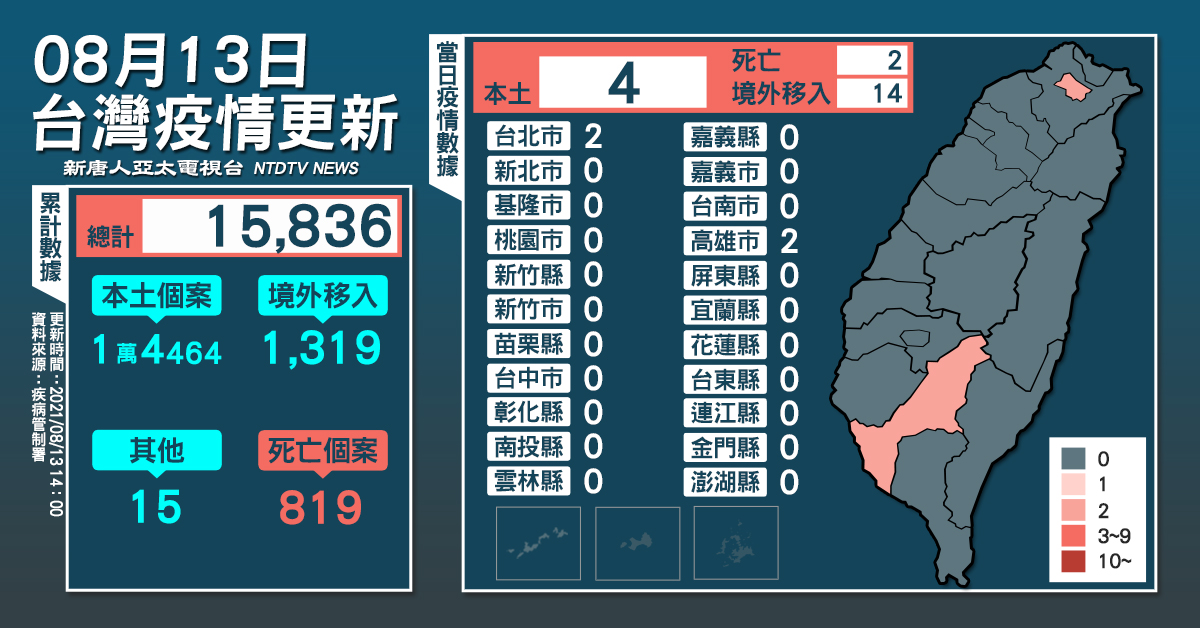【新唐人亞太台 2021 年 08 月 13 日訊】今(13)日中央流行疫情指揮中心公布,國內新增4例本土及14例境外移入;另確診個案中新增2例死亡。