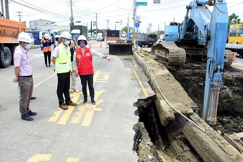 王惠美表示,台14丙線彰興路與聖安路的交叉口因為自來水公司施工造成路面坍方,現在進行緊急搶修,彰化工務段也允諾用最快的速度要求自來水公司務必在今天完成搶修,恢復民眾的用路安全。