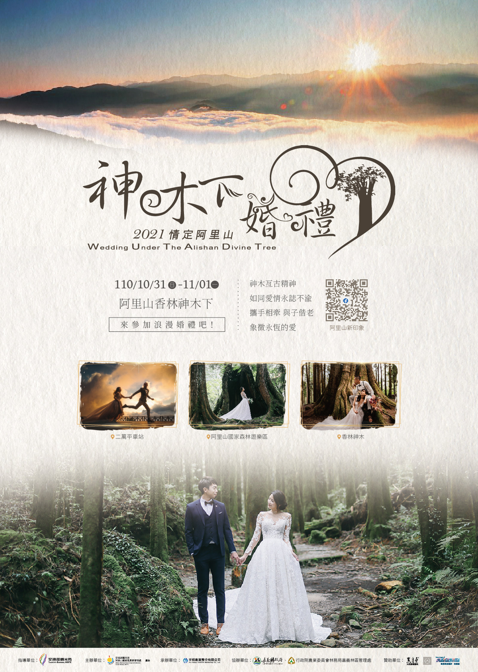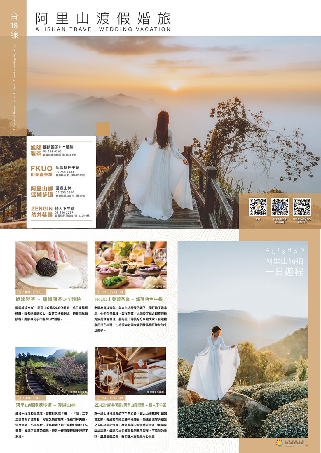 隨著婚拍微旅行風氣盛行,阿管理處打造「阿里山渡假婚旅」,規劃以台18線,及西北廊道為主軸的兩種遊程,揉合在地自然人文資源與觀光產業,將茶文化融入體驗行程,加入蘊含祝福意味的「團茶」、「封茶」手作活動,象徵夫妻同心協力面對婚姻生活。