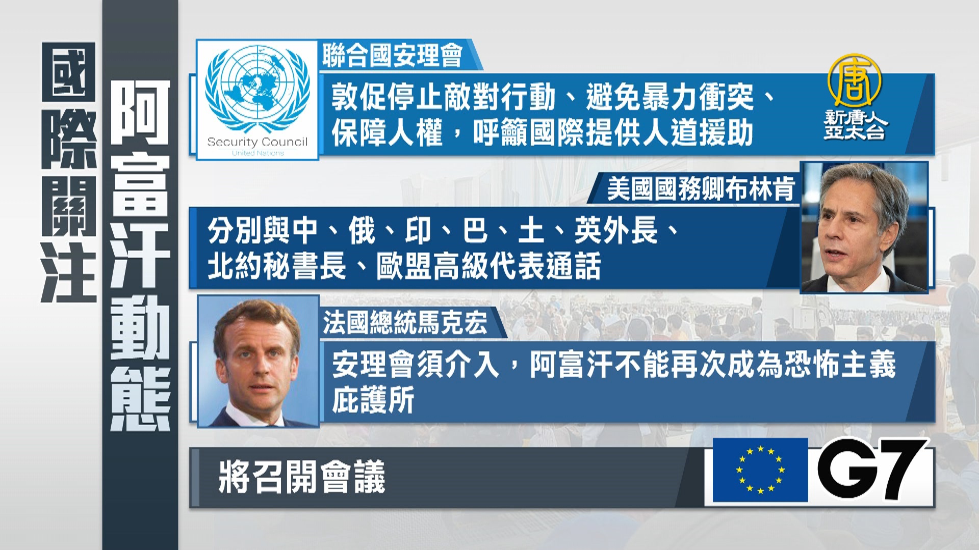 【新唐人亞太台 2021 年 08 月 17 日訊】阿富汗局勢動盪,受到國際高度關注。我們為您整理最新動態,16號,聯合國安理會緊急召開會議,敦促各方停止敵對行動、避免暴力衝突和保障人權,也呼籲國際社會提供人道援助。同一天,美國國務卿布林肯也分別就阿富汗局勢與多個國家的外長通話,包括中國、俄羅斯、印度、巴基斯坦、土耳其和英國等。布林肯還和歐盟高級代表以及北約秘書長進行了話。國務院沒有對外公布談話內容。另外,法國總統馬克宏表示,要讓阿富汗恢復穩定,需要安理會採取政治和外交行動,阿富汗絕不能再次成為恐怖主義的庇護所。接下來,歐盟和G7都將召開會議,討論阿富汗局勢。