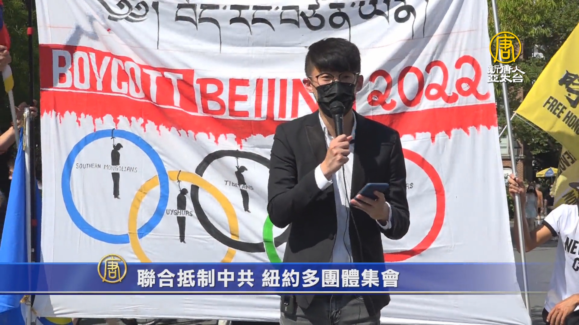 記者:「我們現在的位置是在華盛頓廣場花園,在我後方有來自香港、緬甸、新疆、西藏等國家和地區的民眾,他們在這裡共同聲討中共的惡行。」