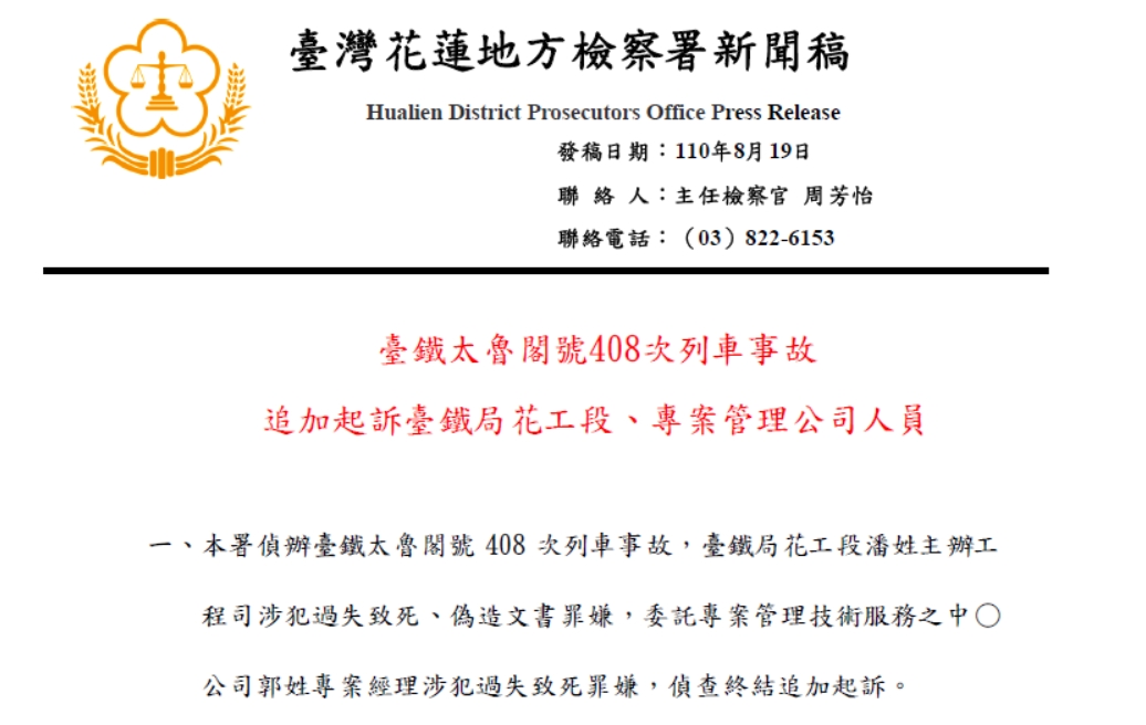 一、本署偵辦臺鐵太魯閣號408次列車事故,臺鐵局花工段潘姓主辦工程司涉犯過失致死、偽造文書罪嫌,委託專案管理技術服務之中○公司郭姓專案經理涉犯過失致死罪嫌,偵查終結追加起訴。