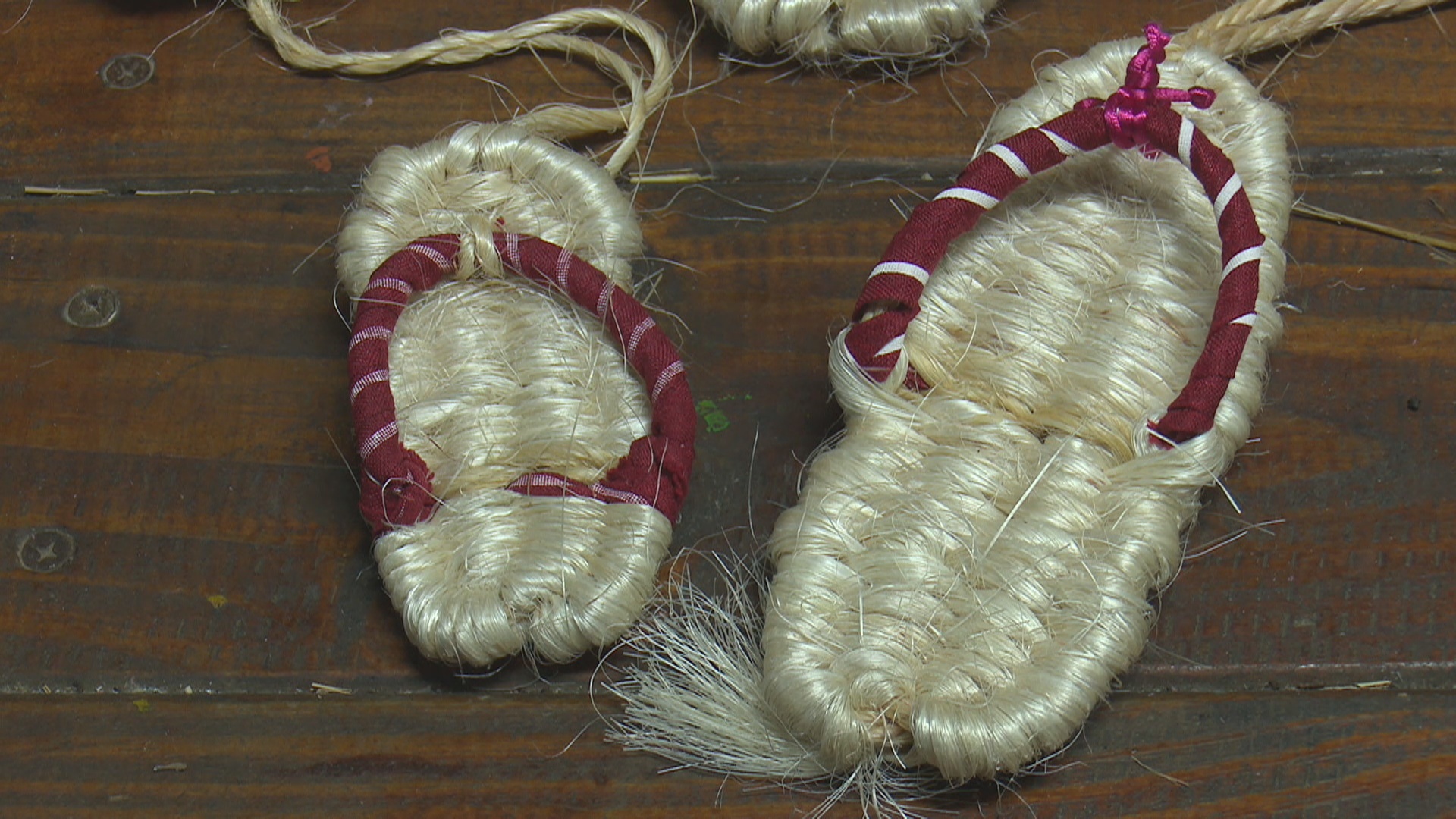 大小不一,輕巧可愛的瓊麻拖鞋,是由一絲絲雪白的瓊麻編織而成的,需要花上5小時才能完成的瓊麻鞋,不但具有耐磨、不易發霉等環保功能,也是現在塑膠鞋無法取代的溫度感。