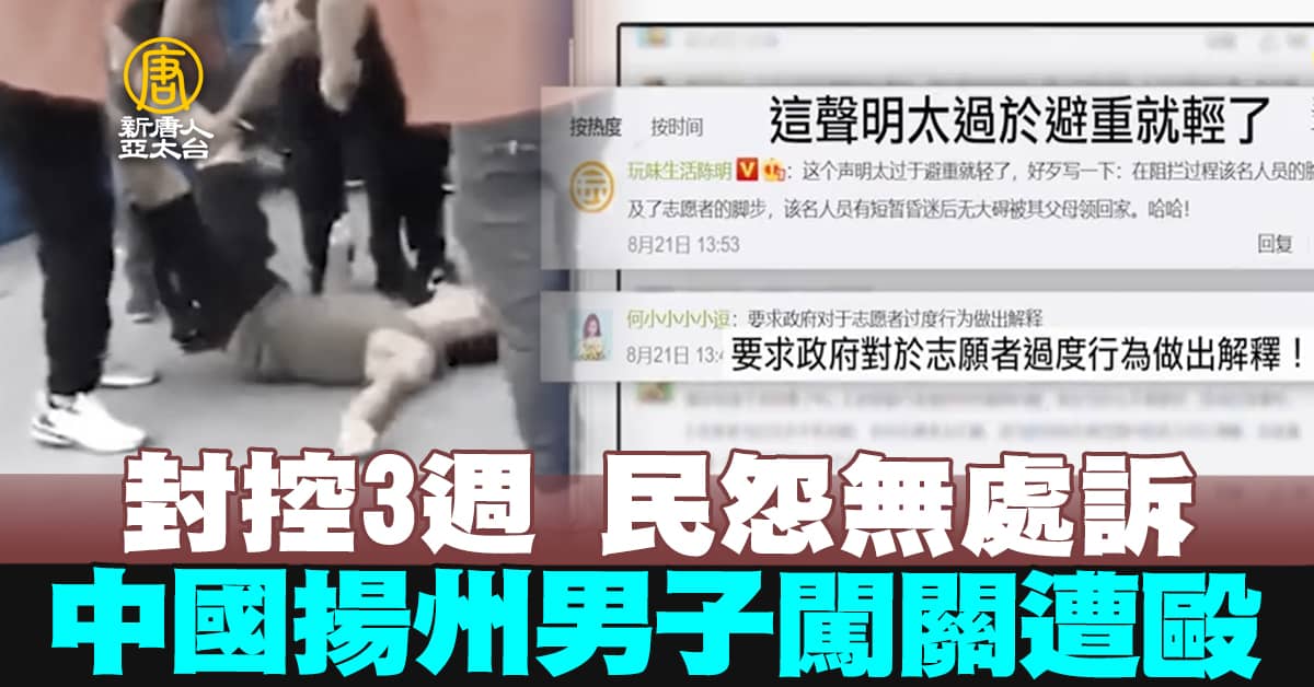 【新唐人亞太台 2021 年 08 月 23 日訊】疫情下中共對民眾實施嚴厲的封控措施,頻頻造成衝突,封控超過3週的揚州市,傳出有男子因為闖檢查點,遭到痛毆。