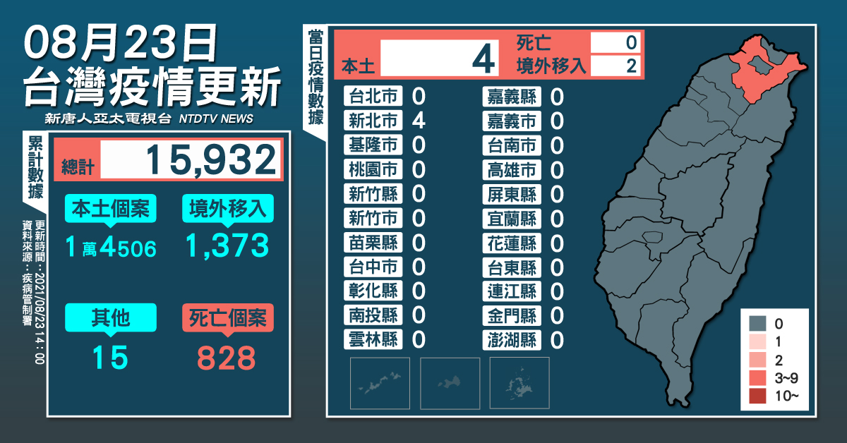 【新唐人亞太台 2021 年 08 月 23 日訊】今(23)日中央流行疫情指揮中心公布,國內新增4例本土及2例境外移入;另確診個案中無新增死亡。