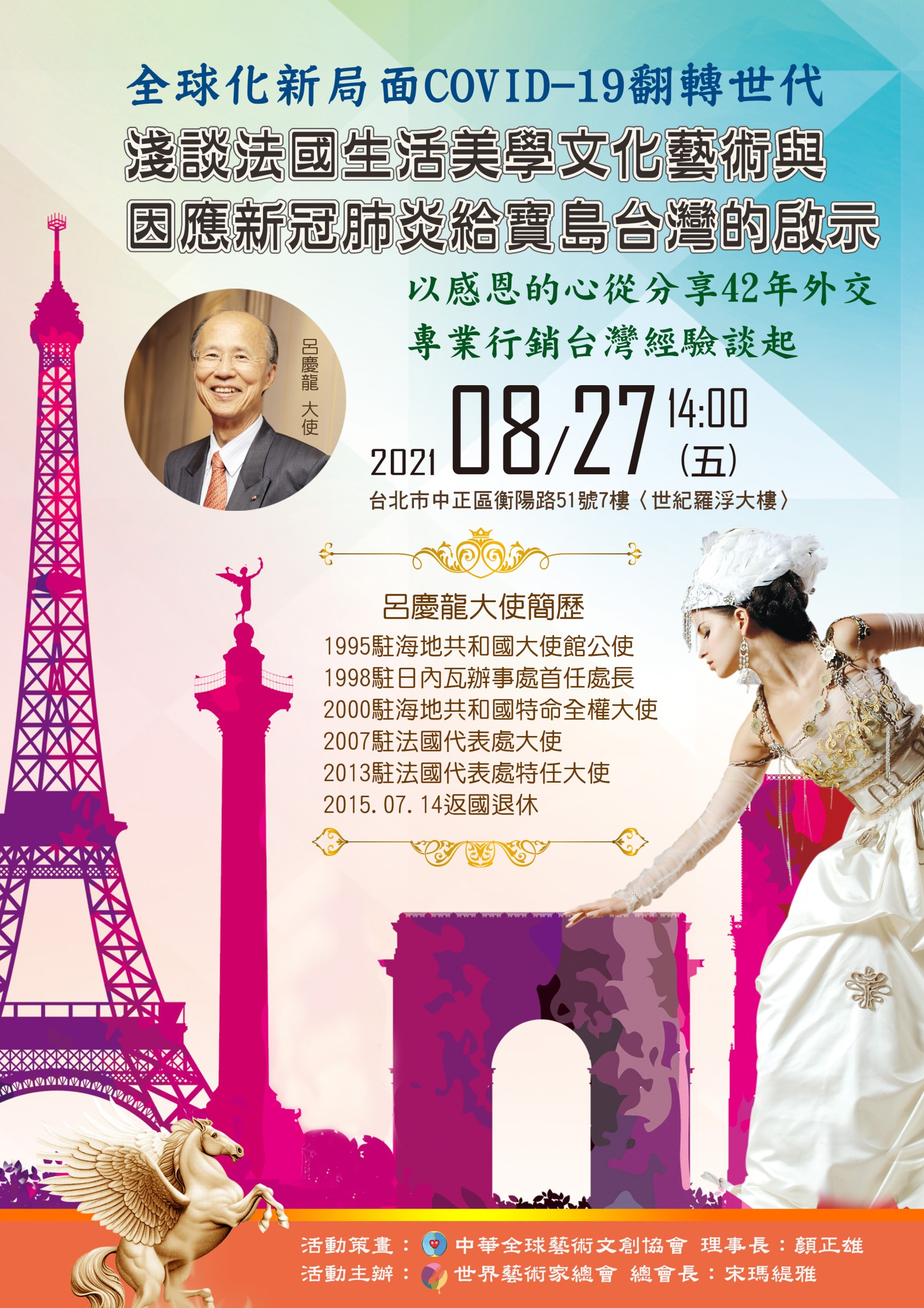 演講題目:「淺談法國生活美學文化藝術與因應新冠肺炎給台灣寶島的啟示」-以感恩的心從分享42年外交專業行銷台灣經驗談起