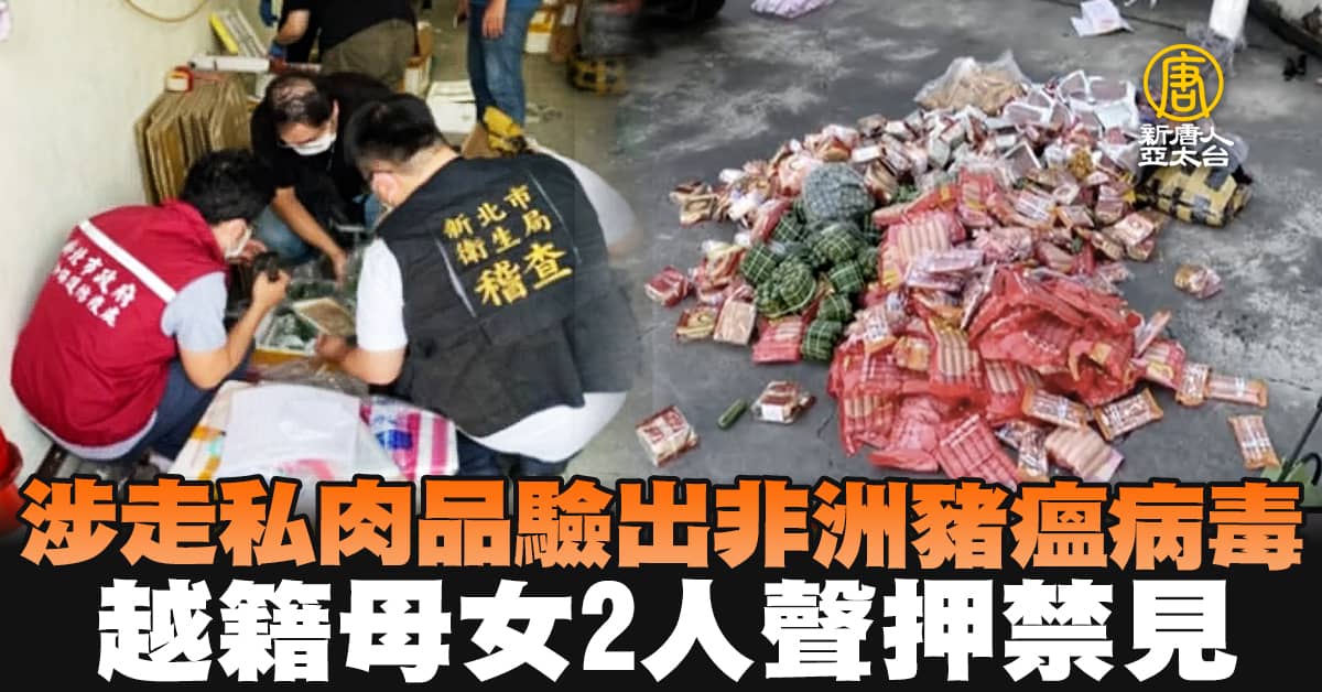 【新唐人亞太台 2021 年 08 月 23 日訊】新北市警方在新莊區查獲總重量超過71公斤的走私月餅、熱狗、火腿腸及豬肉捲,等7項越南肉製產品,經農委會查驗,肉品內有非洲豬瘟病毒,雖然所有貨物已經銷毀,但新北地檢署立即組成專案小組搜查,發現越南籍鄧姓負責女子和女兒阮姓女子,涉嫌走私相關肉製品,認為有逃亡之虞,且感染肉品恐已遍及全台,因此向法院聲押禁見2人。