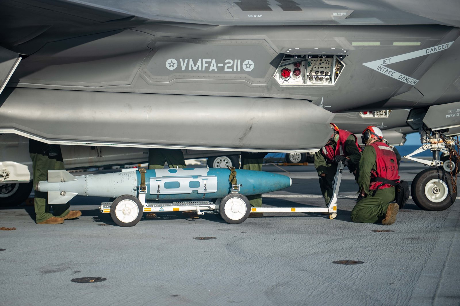 美軍透露圖片顯示,F-35B的內置彈倉,演習中裝載了精確制導炸彈,至少1000磅;可能打擊目標有多種選項,可以是中共軍隊登陸集結點、指揮中心、大型戰艦,甚至中共在南海的人工島礁。儘管一些任務還有B-52轟炸機來承擔。