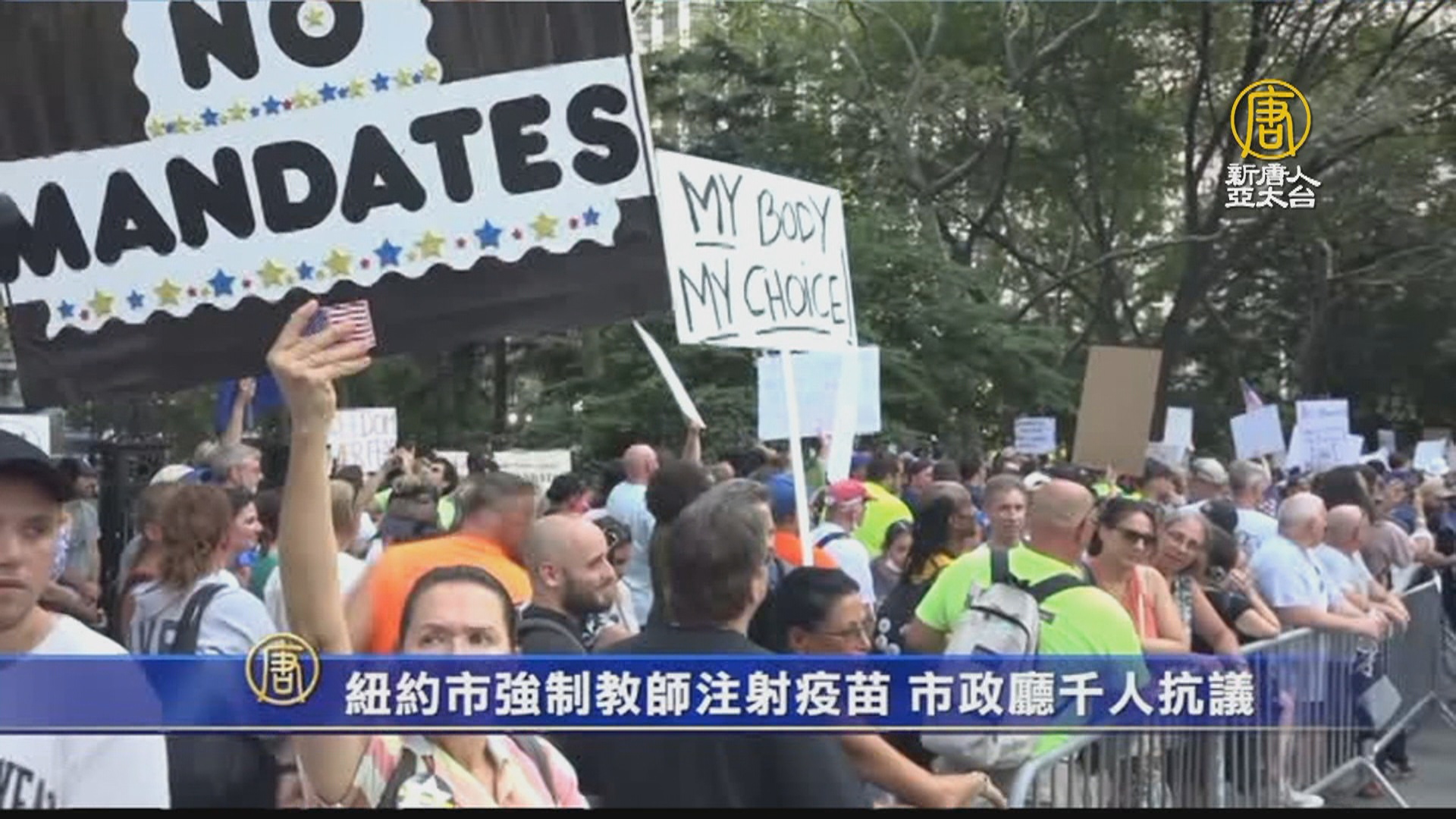 【新唐人亞太台 2021 年 08 月 26 日訊】鏡頭轉到美國紐約,紐約市長白思豪在週一要求所有公立學校的教師和工作人員,必須強制接種疫苗。週二,上千位民眾來到市政廳抗議。