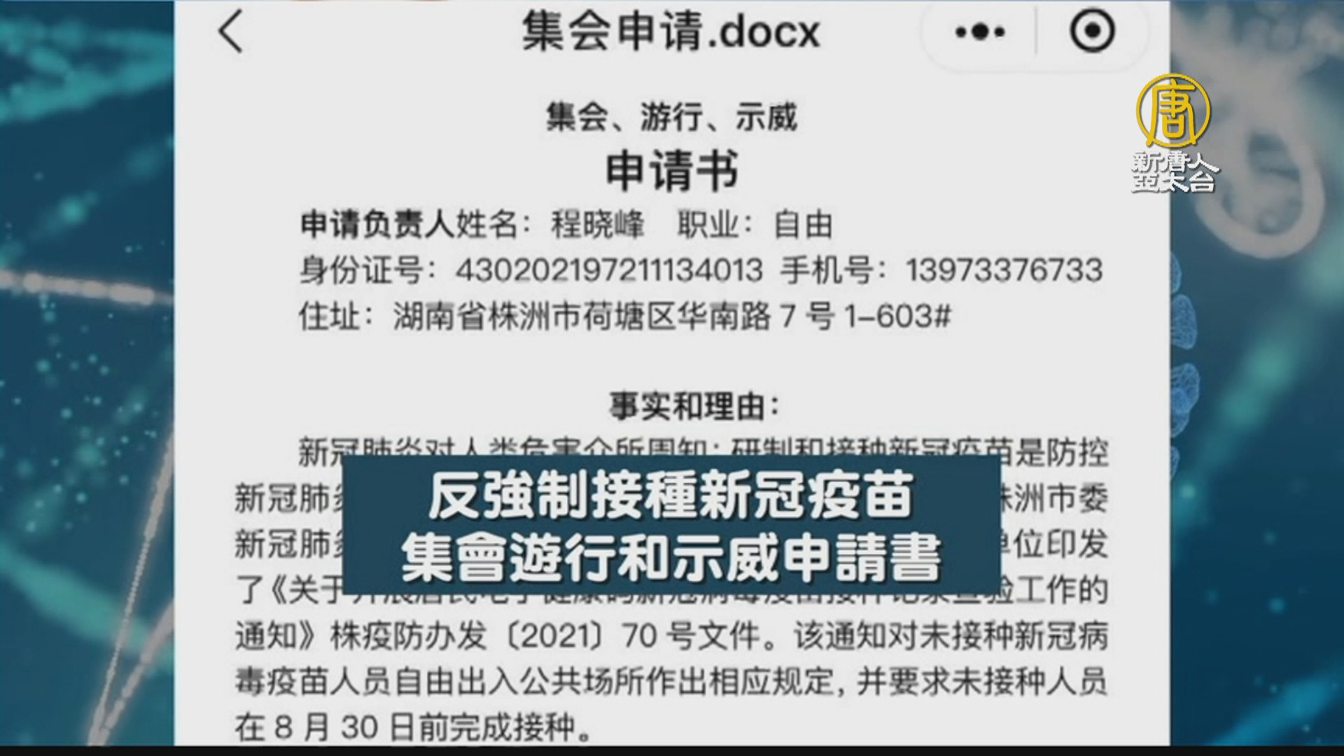 【新唐人亞太台 2021 年 08 月 26 日訊】在中國,民眾只能施打中國製疫苗,但民眾認為官方資訊不透明;周二,一名湖南株洲人,以反對強制接種疫苗,向當地申請遊行,獲得大批民眾支持,這位申請人後來被公安局找去問話。