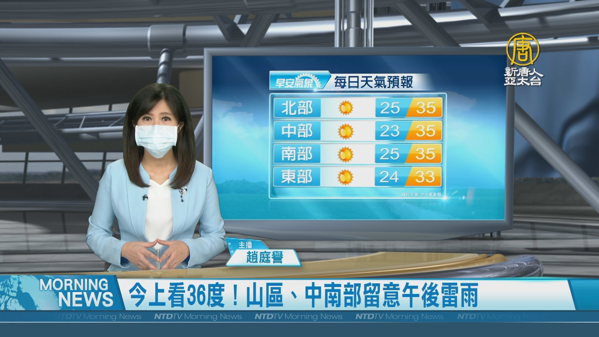 【新唐人亞太台 2021 年 08 月 27 日訊】歡迎您收看8月27日的早安新唐人,我是趙庭譽,先來帶您關心天氣。今天各地天氣炎熱,高溫約33度至35度,尤其在大台北、桃園地區、高屏近山區內陸及花東縱谷有36度以上高溫發生的機率,近中午感受較悶熱,提醒觀眾朋友外出請多補充水分。帶您一起來看到,國際媒體重要訊息。