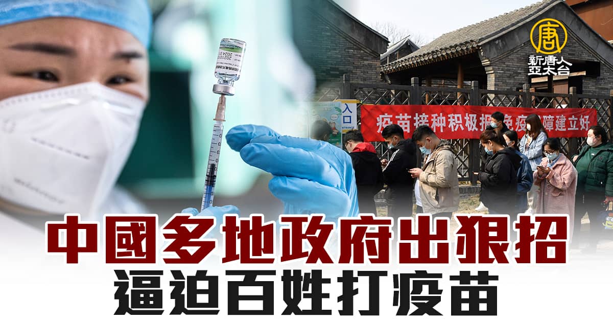 【新唐人亞太台 2021 年 08 月 27 日訊】鏡頭轉到中國大陸,中共當局強逼民眾接種中共的病毒疫苗,大陸各地當局狠招盡出,無所不用其極。黑龍江省「龍江縣」,把沒有接種疫苗的人,定為病毒接觸者進行隔離、費用自理。江蘇省「泗陽縣」則以停發工資作為要脅。在中央下達指標的壓力下,中國疫苗接種亂象叢生。