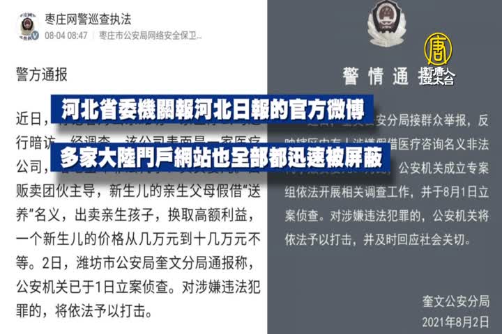 【新唐人亞太台 2021 年 08 月 27 日訊】河北省張家口市沽源縣公安局8月25號發布消息說,他們14號抓到一名22歲的任姓女子,她涉嫌在7月底將自己生下的孩子,以7萬元的價格,賣給了山東省濰坊市奎文區的一家醫療科技公司。