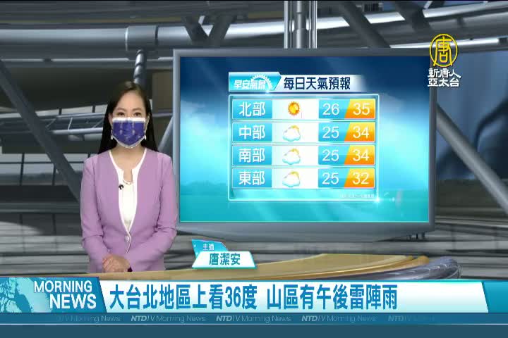 【新唐人亞太台 2021 年 08 月 30 日訊】歡迎您收看8月30日的早安新唐人,我是唐潔安,先來帶您關心天氣。又是一個星期的開始了,全台天氣今天大多為多雲到晴,各地氣溫炎熱,大台北地區則有36度以上高溫,提醒您注意防曬及補水;帶您一起來看到國際媒體重要訊息。