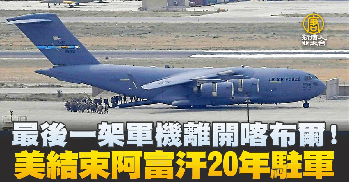 【新唐人亞太台 2021 年 08 月 31 日訊】早安新唐人,國際動態先來看到,美國五角大樓週一下午宣布,美東時間30日下午3點29分,最後一架搭載服務人員的 C-17運輸機從喀布爾機場起飛離開,所有美軍都已撤離,阿富汗撤離行動提前結束。
