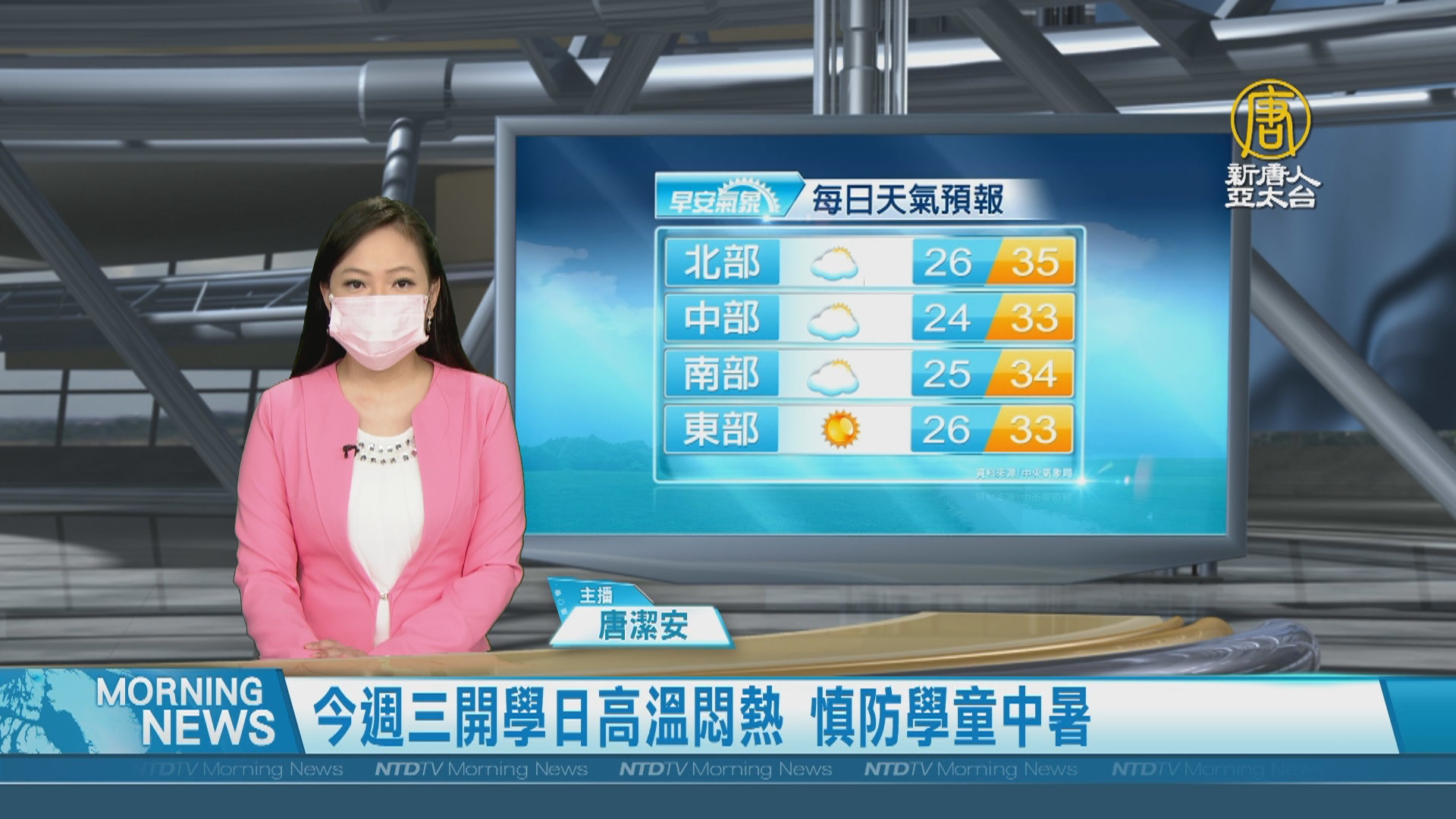 【新唐人亞太台 2021 年 09 月 01 日訊】歡迎您收看9月1日的早安新唐人,我是唐潔安,先來帶您關心天氣。今天是全台中小學開學日,上午各地晴朗高溫炎熱,雙北、桃園及東半部高溫能達36度。其他地區高溫約32度至35度,提醒觀眾朋友注意防曬,多補充水分。帶您一起來看到國際媒體重要訊息。