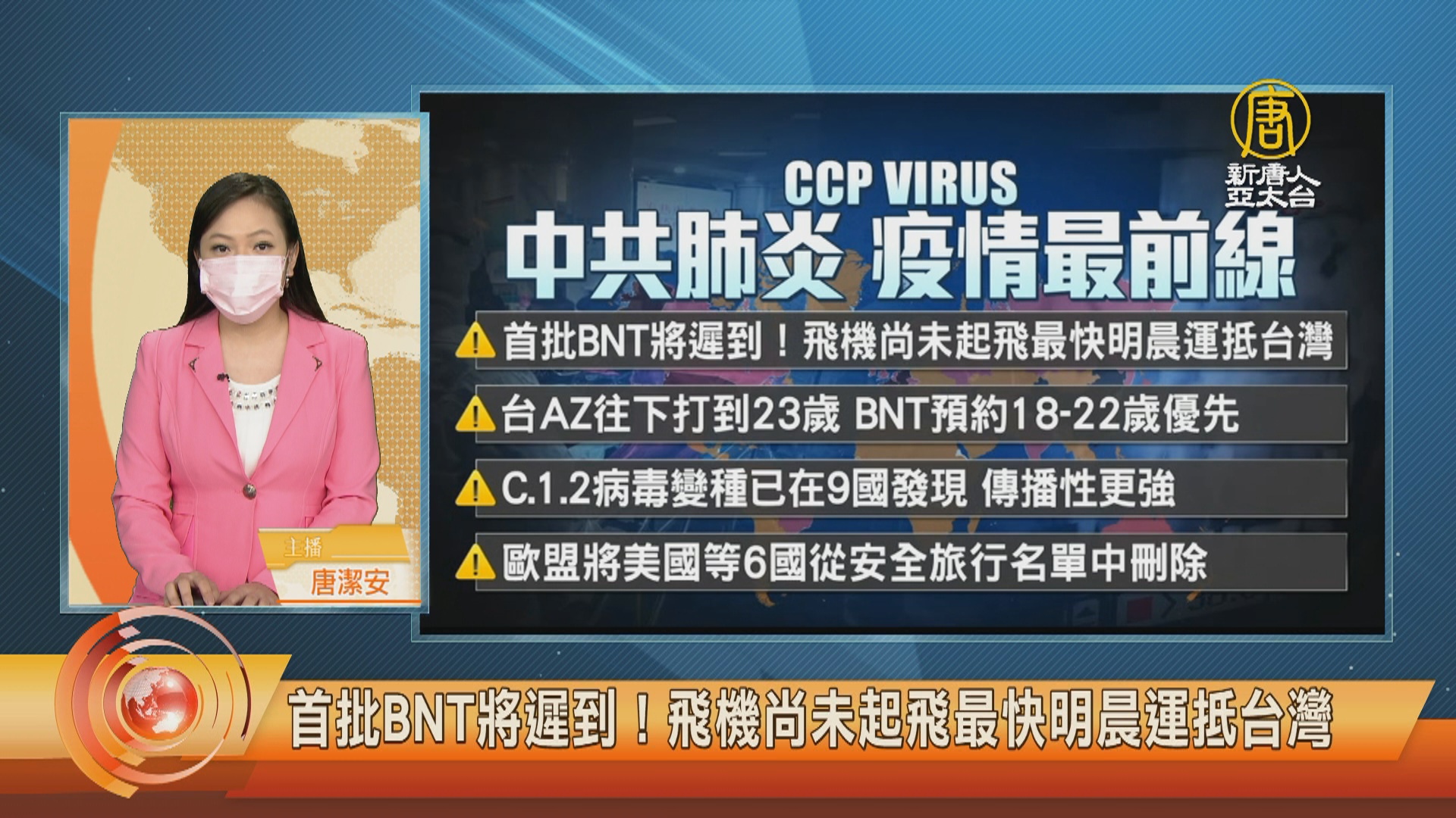 【新唐人亞太台 2021 年 09 月 01 日訊】新聞開始,先來關心全球超過2億1千萬人確診,超過452萬病逝,今早有哪些疫情動態,首批BNT將遲到!飛機尚未起飛最快明晨運抵台灣。台灣AZ往下打到23歲,BNT預約18-22歲優先。C.1.2病毒變種已在9國發現,傳播性更強。歐盟將美國等6國從安全旅行名單中刪除。