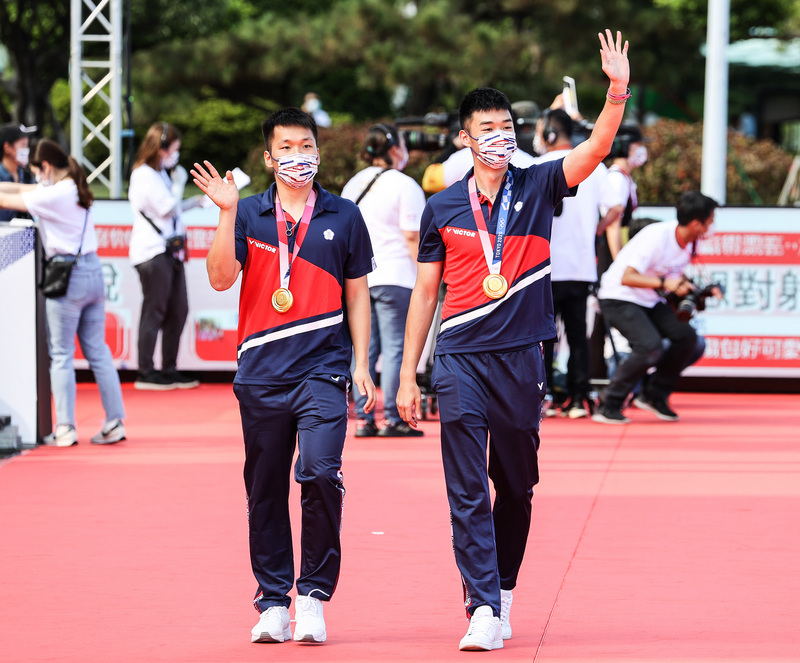 台灣英雄凱旋派對1日下午在總統府登場,現場並安排代表台灣出征東京奧運的運動好手們走上星光紅毯,羽球男雙金牌組合「麟洋配」李洋(前左)、王齊麟(前右)一同現身。(圖/中央社)