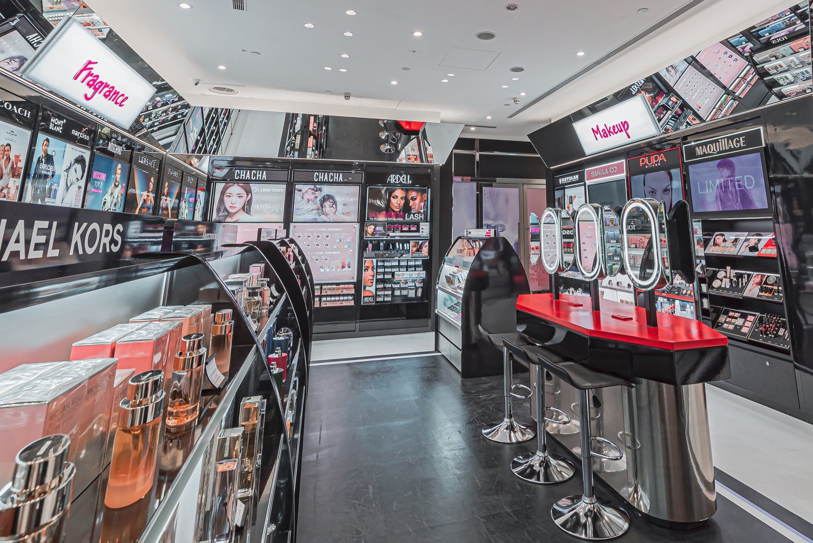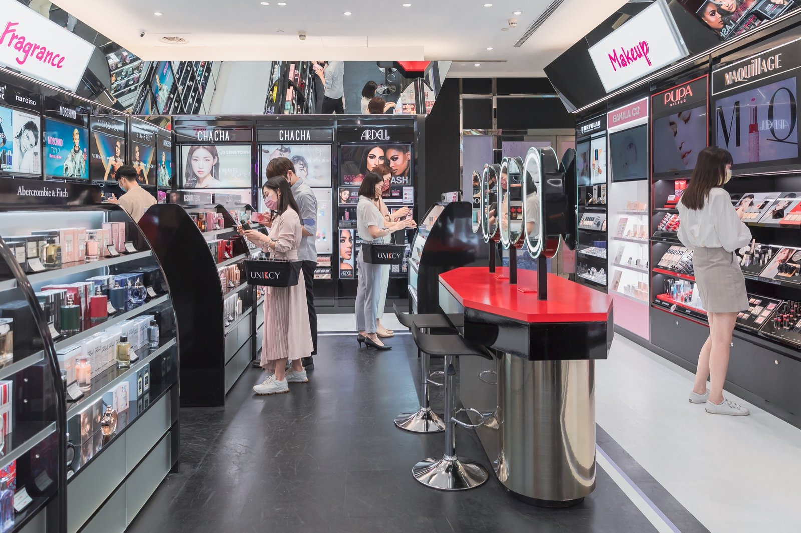 UNIKCY以時尚的黑、白、紅為主視覺,入口兩側以口紅及香水瓶造型雙展示台迎賓;進入館內,令人眼睛為之一亮的紅色蝴蝶結,象徵著UNIKCY分享美麗浪漫的幸福;環店明鏡上鑲崁桃紅色英文字體,以當代藝術的語言帶出俏皮迷人的個性,彷彿引導消費者進入時尚之都,置身瀰漫國際品牌風采的精品街。
