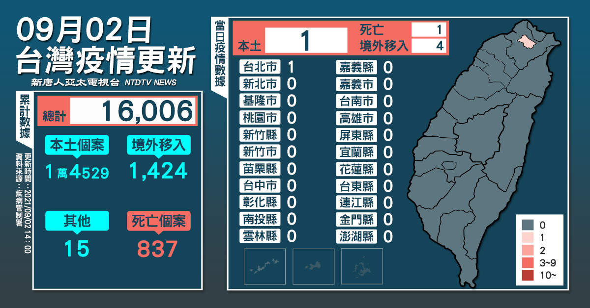 【新唐人亞太台 2021 年 09 月 02 日訊】今(2)日中央流行疫情指揮中心公布,國內新增1例本土及4例境外移入;另確診個案中新增1例死亡。