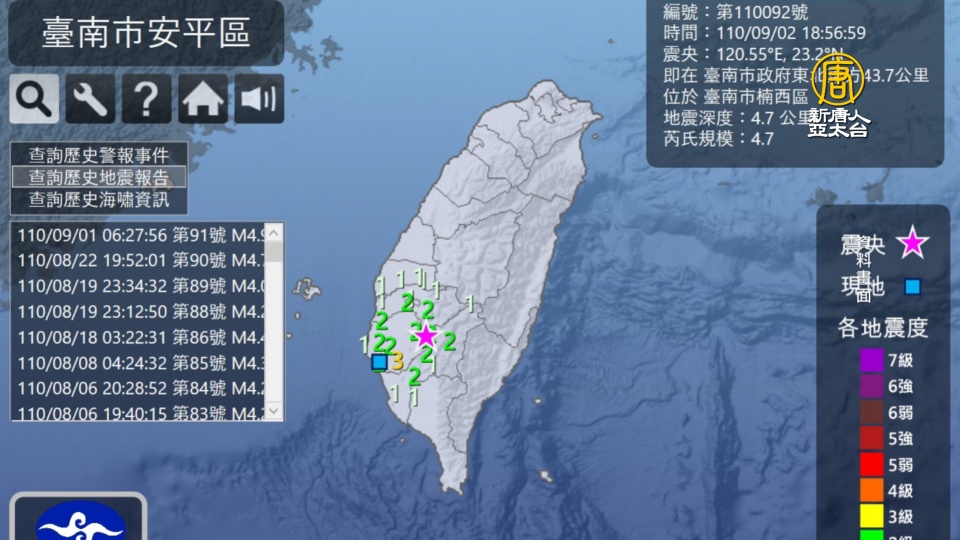 【新唐人亞太台 2021 年 09 月 03 日訊】台南昨晚在13分鐘內,連續發生兩次規模超過4的地震,其中規模最大為芮氏4.7地震,地震深度為4.7公里,震央位在台南楠西區,全台最大的曾文水庫就在這,水利署表示,曾文水庫安全不受影響。