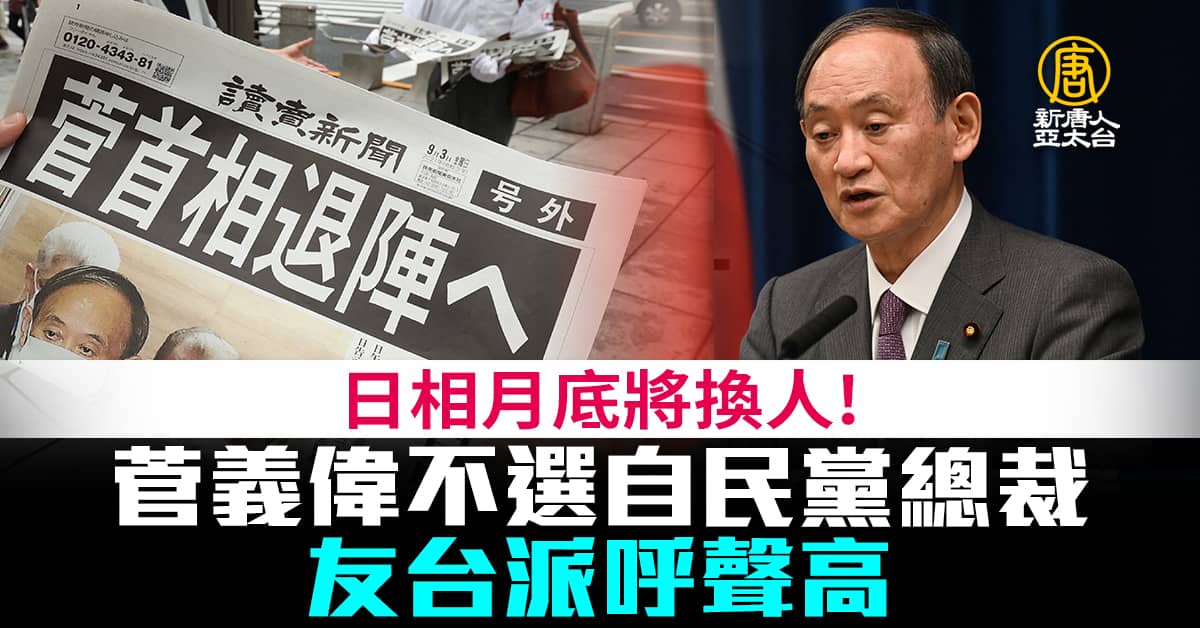 【新唐人亞太台 2021 年 09 月 03 日訊】再來看到,日本首相、自民黨總裁菅義偉今天宣布,不會參加這個月29號舉行的自民黨總裁選舉。目前已經表態參選的人當中,包括友台派岸田文雄。同樣是友臺派的前防衛大臣河野太郎,也有意競逐大位。