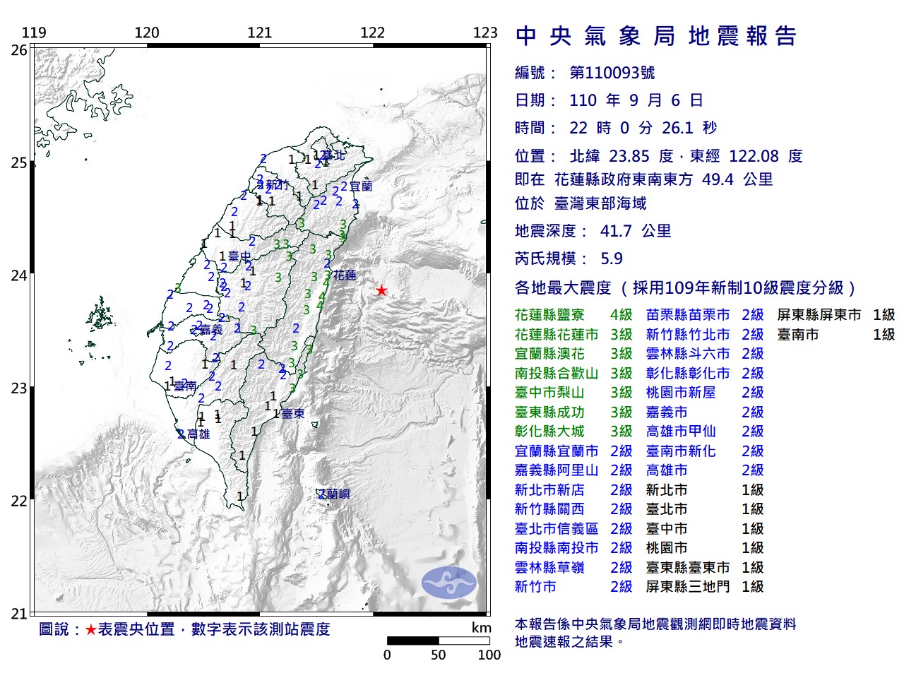 【新唐人亞太台 2021 年 09 月 06 日訊】6日晚間10點,花蓮發生芮氏規模5.9地震,震央在花蓮縣政府東南東方 49.4 公里 ,位處台灣東部海域,地震深度41.7公里,最大震度花蓮4級,北台灣除基隆外均有感搖晃,全台目前尚無災情傳出。