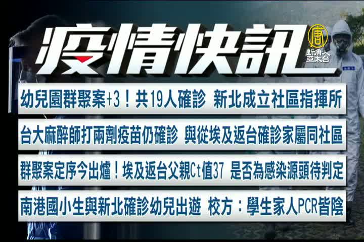 【新唐人亞太台 2021 年 09 月 08 日訊】新聞開始,關心台灣本土疫情,幼兒園群聚案今天增加3人確診!累計共19人確診,新北市已經宣布成立社區指揮所。台大麻醉師打兩劑疫苗仍確診,與從埃及返台確診家屬同社區。另外,這起群聚案的病毒基因定序,下午將公布,是否為Delta病毒受到關注,而從埃及返台的幼童父親,Ct值為37,是否為這起群聚感染源頭仍待判定。另外,南港國小生與新北確診幼兒出遊,校方指出:學生家人PCR皆陰性。
