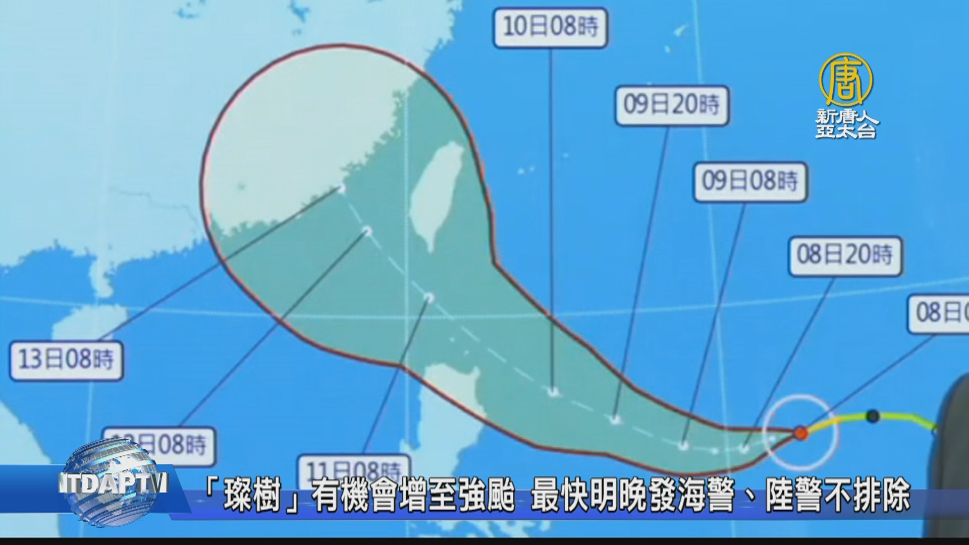 【新唐人亞太台 2021 年 09 月 08 日訊】再來關心,今年第14號颱風「璨樹」持續朝台灣進逼,氣象局預估,接近台灣時可能是以強颱底限或中颱上限強度,依照目前預測路徑,明晚到後天凌晨,有機會發布海上颱風警報,但是否發布陸上警報則還要再觀察,不排除侵台可能,影響最明顯時間為周六到下周一。