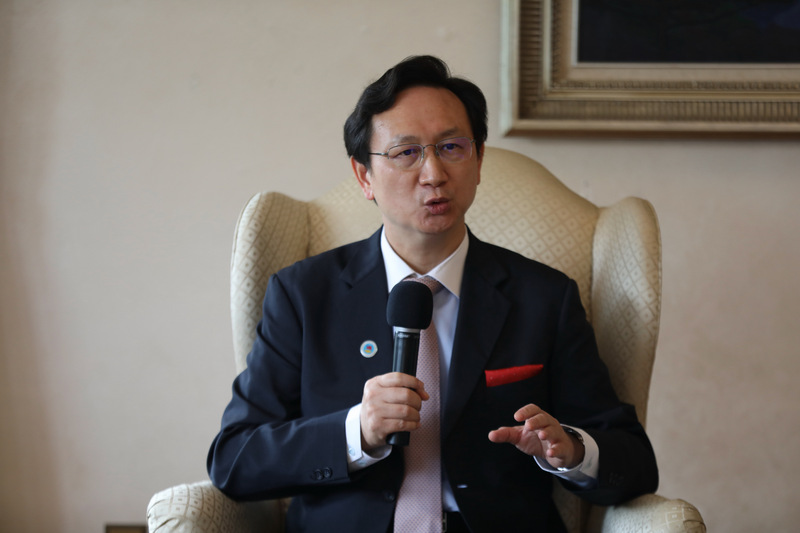 僑務委員會委員長童振源美東時間9日在雙橡園與華文媒體茶敘,分享未來在美拓展台灣華語中心、促進與僑青連結交流等工作計畫。(圖/中央社)