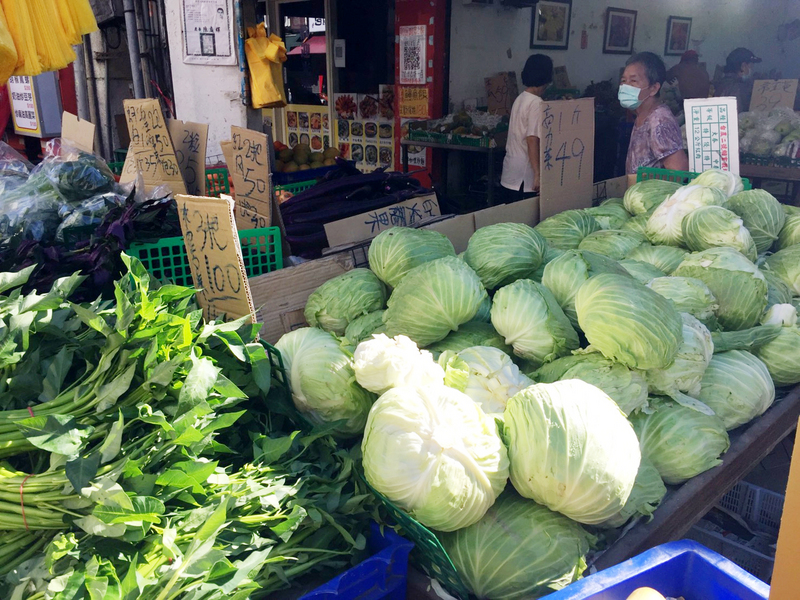 中央社記者走訪傳統市場,高麗菜每台斤49元,每顆居多2.5台斤計算,要價125元;不過短期葉菜仍有促銷特價,3包100元或是2包50元。消費者仍可以選擇相對平價蔬菜食用。