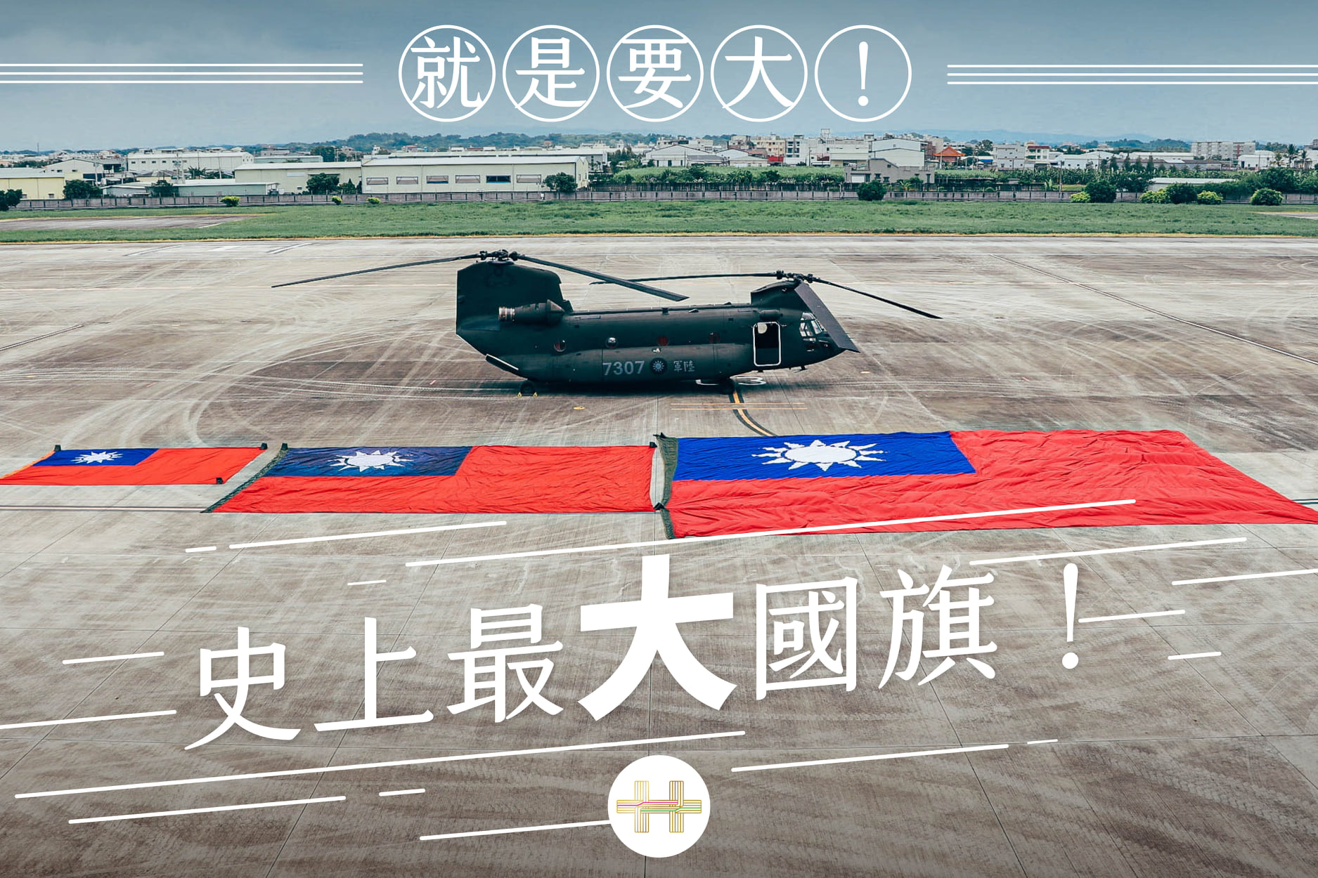 中華民國國慶籌備委員會今天在臉書貼出今年即將登場的巨幅國旗照片,預計在雙十國慶當日,由陸軍CH-47運輸直升機吊掛。(圖/翻攝自臉書@rocbirthday)