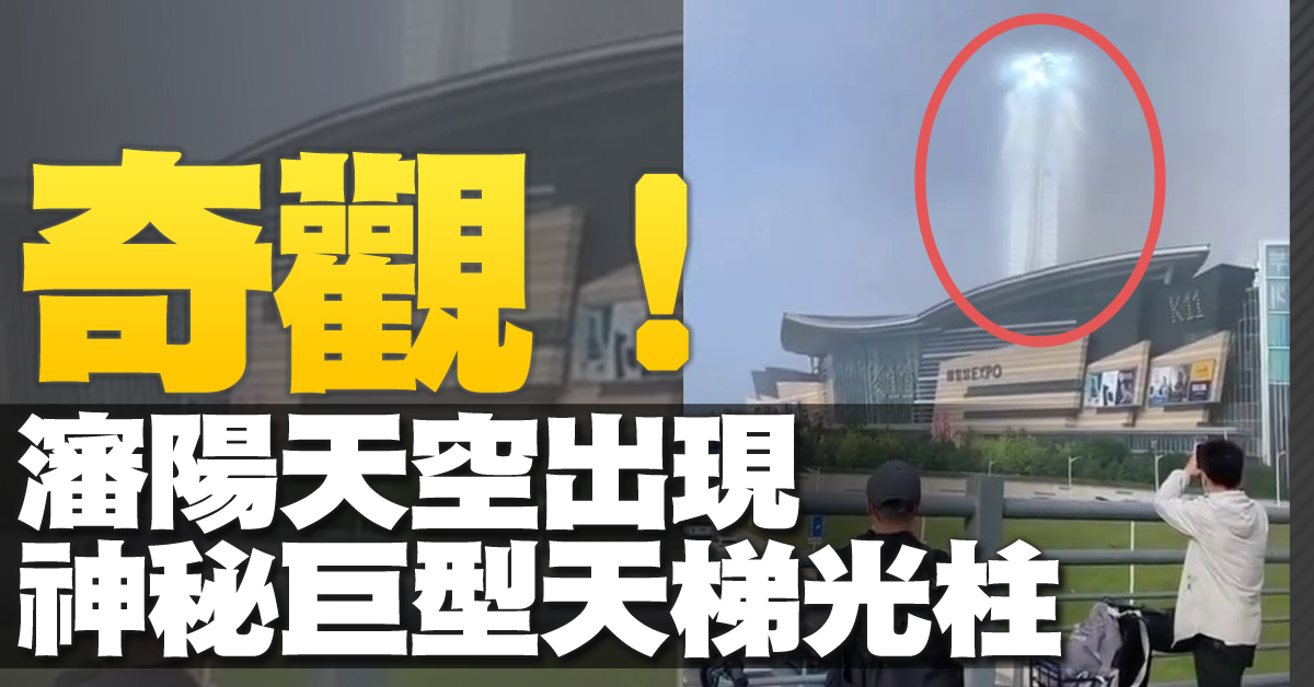 影片中顯示,中國東北瀋陽市K11購物藝術中心上空,一道巨大的光柱從空中照射下來,光柱間還有天梯一樣的物體。