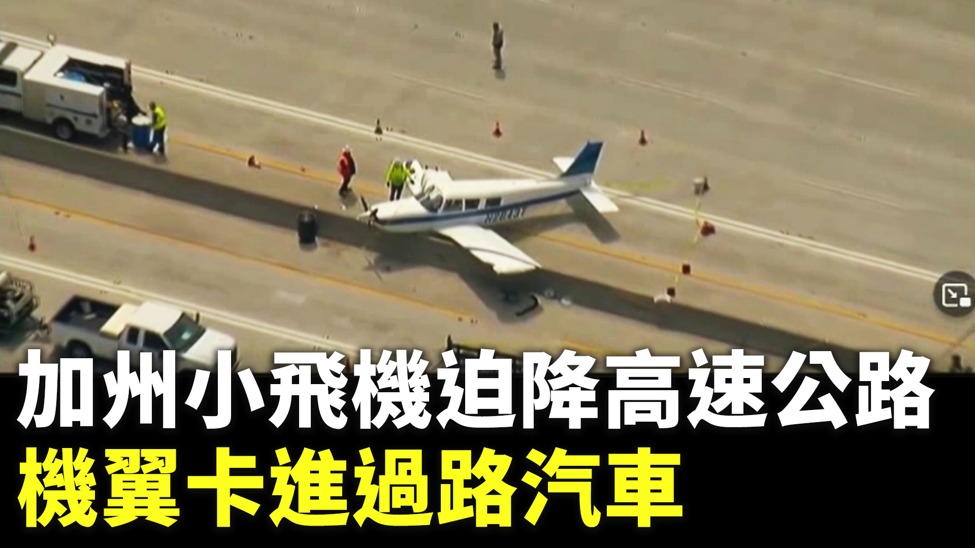 加州小飛機迫降高速公路 機翼卡進過路汽車