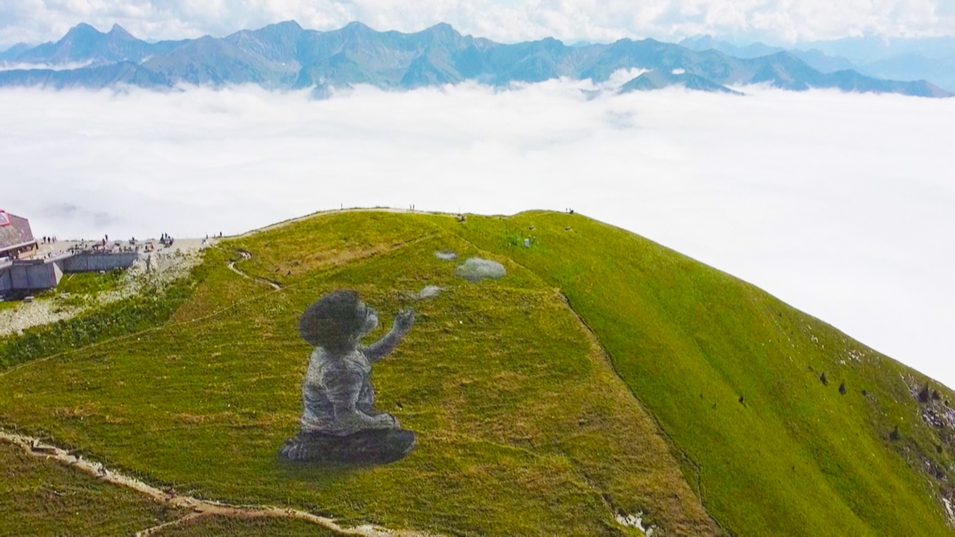 【新唐人亞太台 2021 年 09 月 11 日訊】疫情危機令全球陷入恐懼,為了勉勵世人懷抱希望,法國一位大地藝術家來到阿爾卑斯山脈的莫雷松山(Moleson)山頂上,巧妙將雲海與大片的綠色山坡結合,繪製了一幅可愛小男孩吹泡泡的巨型大地畫作。