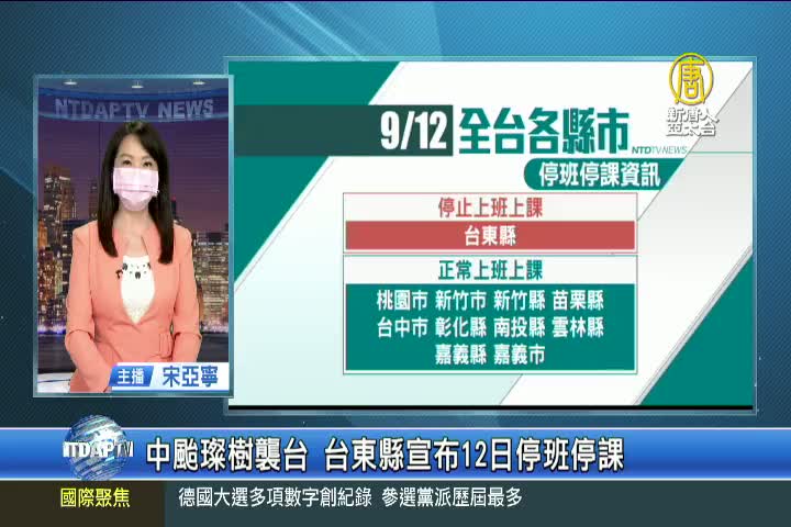 【新唐人亞太台 2021 年 09 月 11 日訊】中颱璨樹逐漸北上,對台灣的威脅增加,各地陸續出現強風豪雨,全台警戒。目前,目前台東縣已宣布12日停止上班上課,桃園、新竹、苗栗、台中、彰化、雲林、南投、嘉義則宣布,12日風雨未達停班停課標準,正常上班、上課。北北基是否停班停課,預計晚間10點前宣布。