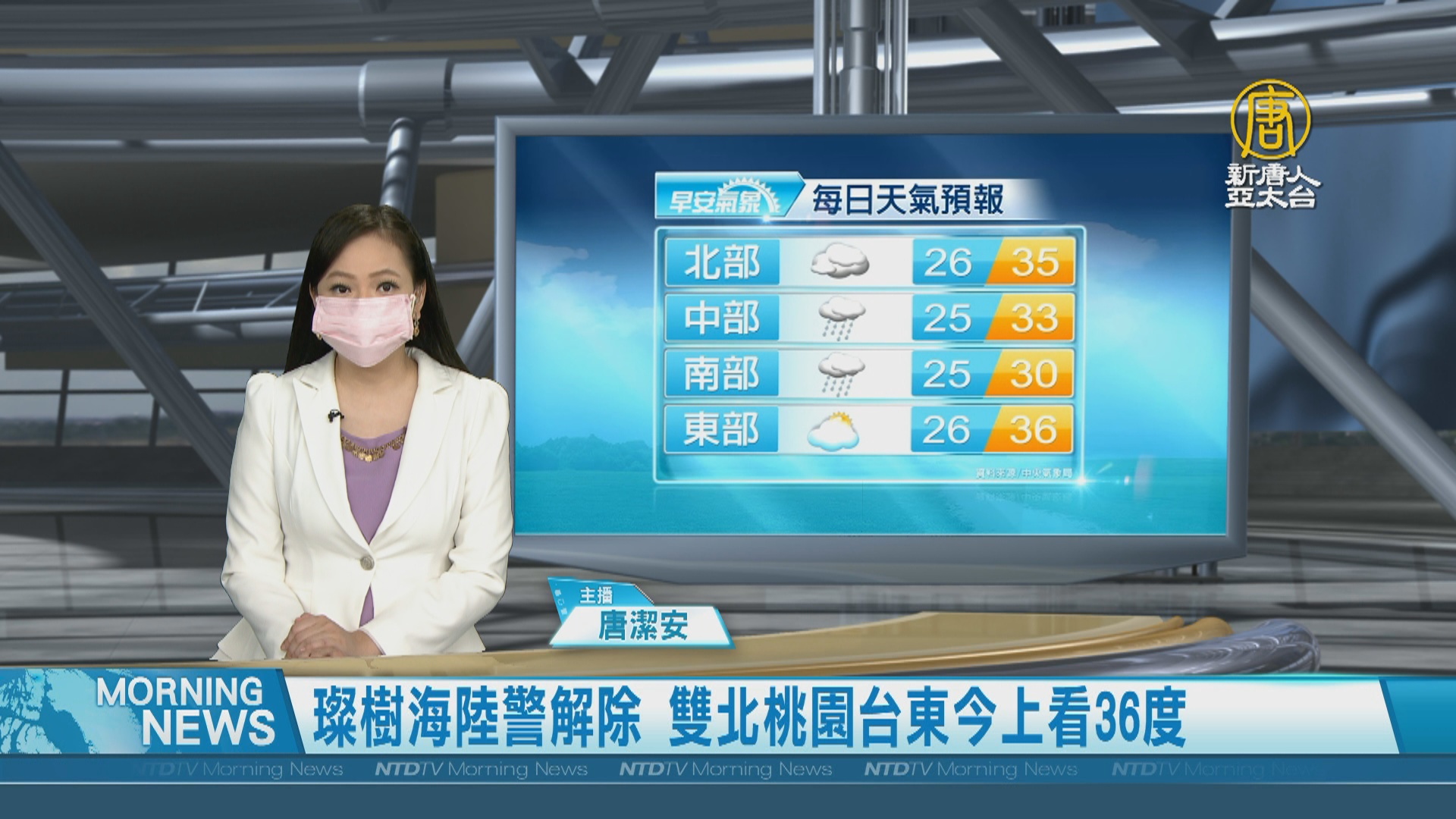 【新唐人亞太台 2021 年 09 月 13 日訊】歡迎您收看9月13日的早安新唐人,我是唐潔安,先來帶您關心天氣。又是一個星期的開始了,中颱璨樹遠離,海陸警報都解除,今天全台恢復正常上班課,氣溫回升,雙北、桃園及台東可能會有36度以上高溫,但南部地區受西南風影響仍有局部大雨。帶您一起來看到國際媒體重要訊息。