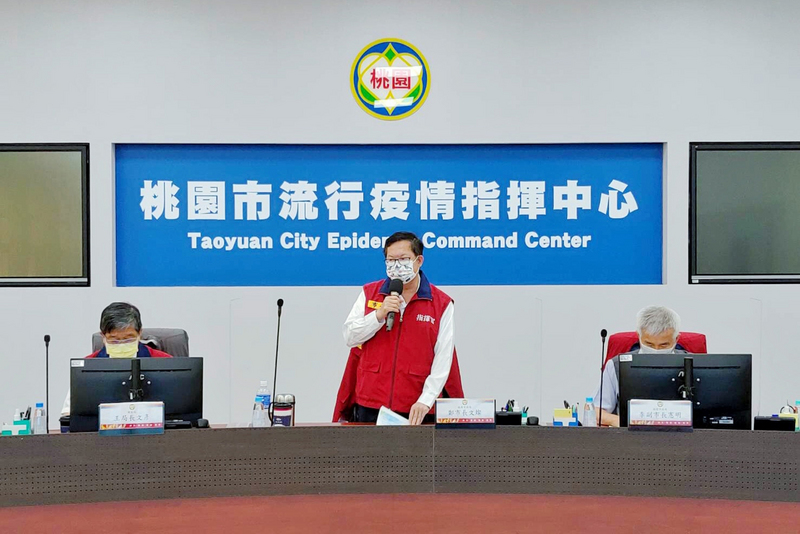 桃園市長鄭文燦(中)13日上午在COVID-19防疫專案會議中表示,新北市幼兒園群聚感染事件延伸至桃園市一對夫妻確診案,桃園市目前共匡列31人進行採檢。(圖/中央社)