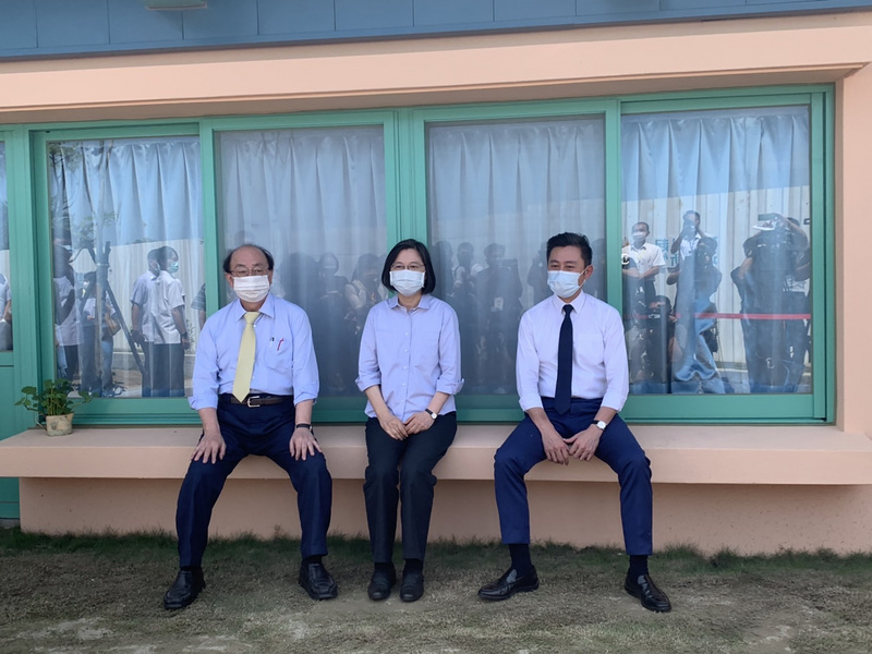 總統蔡英文(中)在新竹市長林智堅(右)、民進黨立法院黨團總召柯建銘(左)陪同下,於新竹市視察華德福實驗學校幼兒園時說,近日討論的(縣市)合併議題,是希望合併促進區域發展,確實是攸關國家整體規畫重大議題,須審慎討論。(圖/中央社)