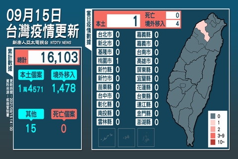【新唐人亞太台 2021 年 09 月 15 日訊】今(15)日中央流行疫情指揮中心公布,國內新增1例本土及4例境外移入;另確診個案中無新增死亡。