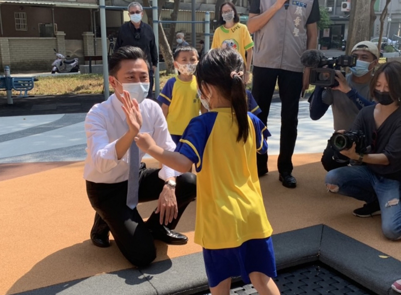 新竹市長林智堅(左)16日出席興南公園改造啟用活動時受訪表示,坊間民意調查顯示新竹縣、市民對縣市合併升格為直轄市議題知悉度74%、支持度56%,「郎有情、妹有意」,希望早日促成。(圖/中央社)